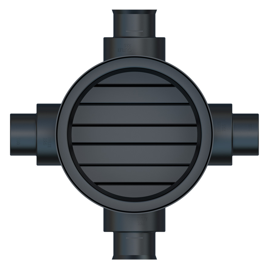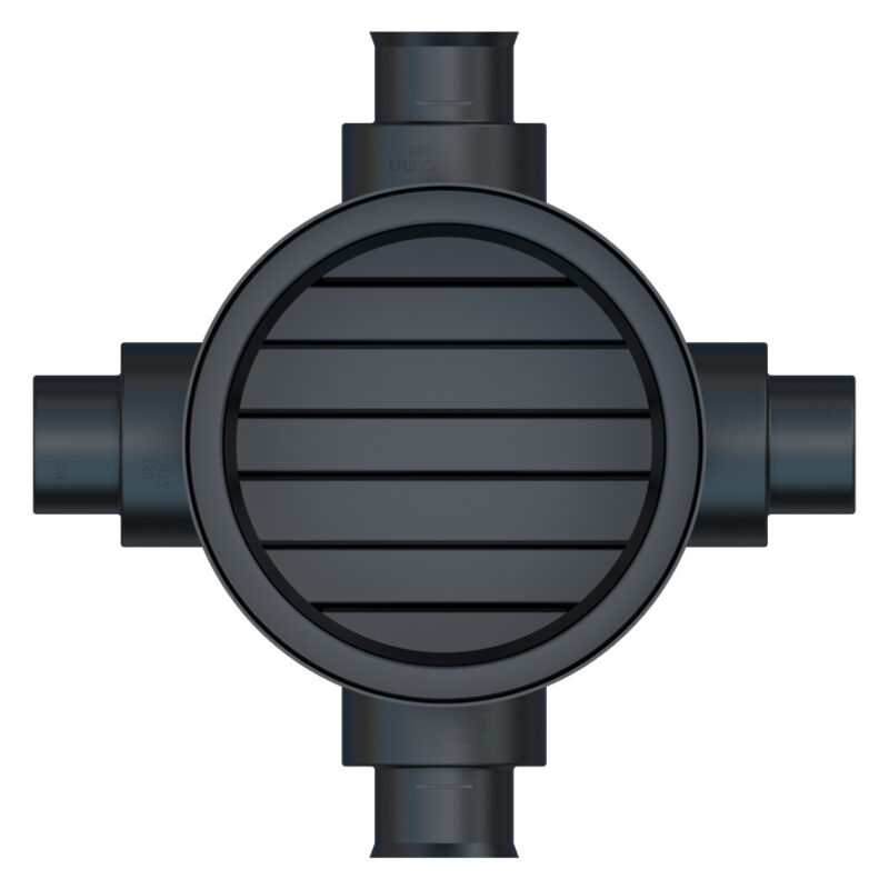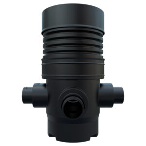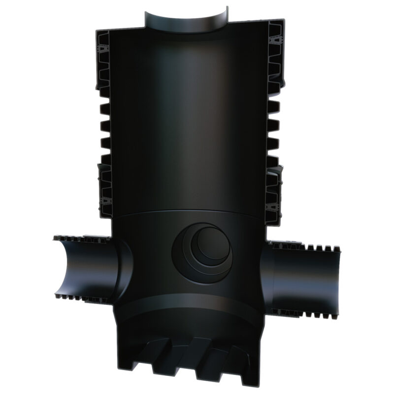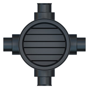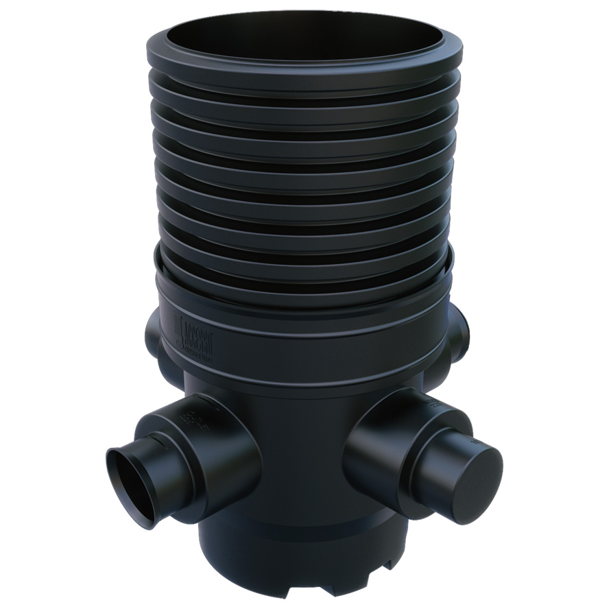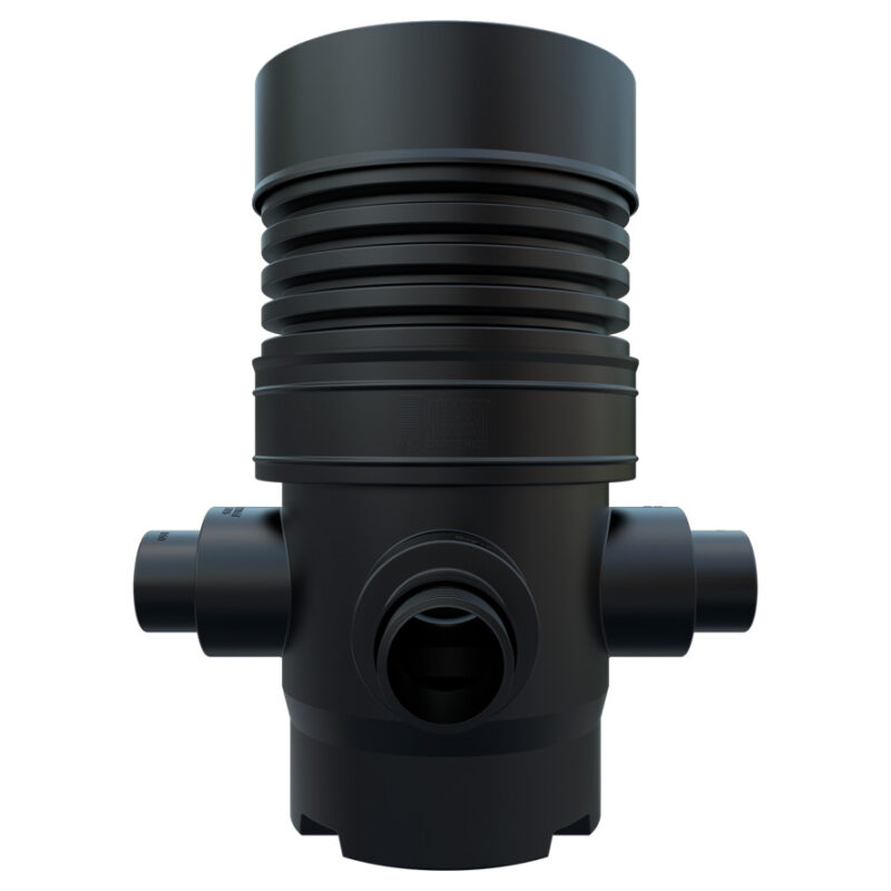 This Accesso catchpit chamber: Model – AICCP600225150CB – has a Ø 600mm rotational moulded chamber base with 150mm or 225mm main channel socket connections, it also includes two further 150mm or 225mm side inlets at 90° and 270° from the outlet at 0°, which are provided as blanked ends for use as required.