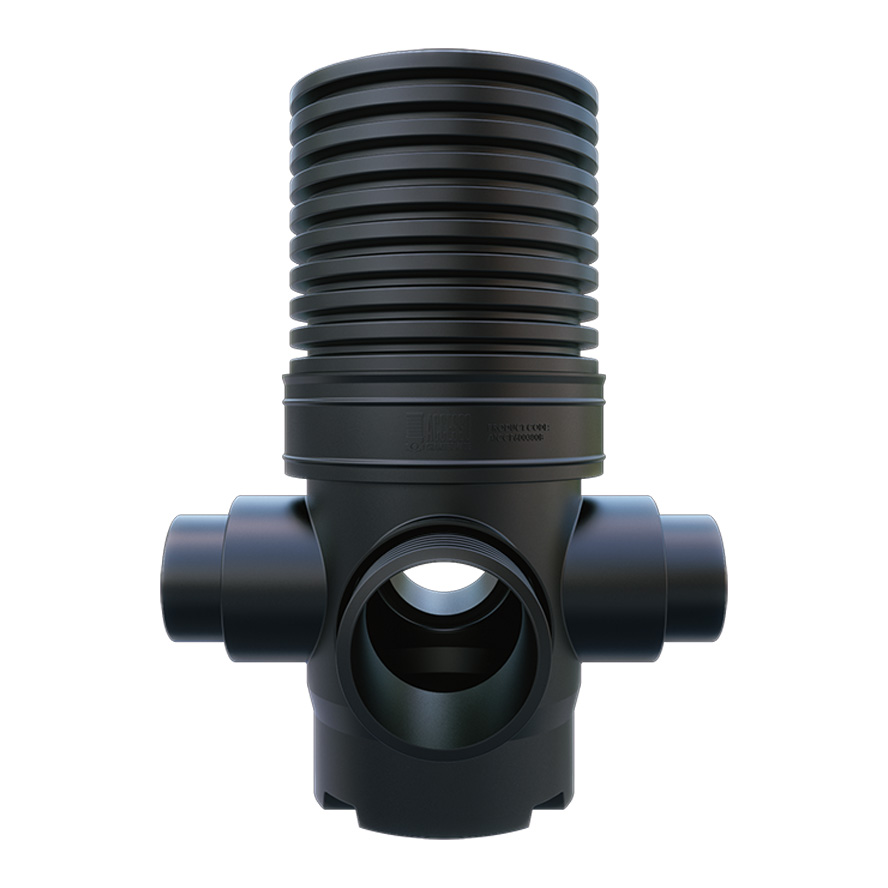 This Accesso catchpit chamber: Model – AICCP600300225B – has a Ø 600mm rotational moulded chamber base with 225mm or 300mm main channel socket connections, it also includes two further 225mm or 300mm side inlets at 90° and 270° from the outlet at 0°, which are provided as blanked ends for use as required.