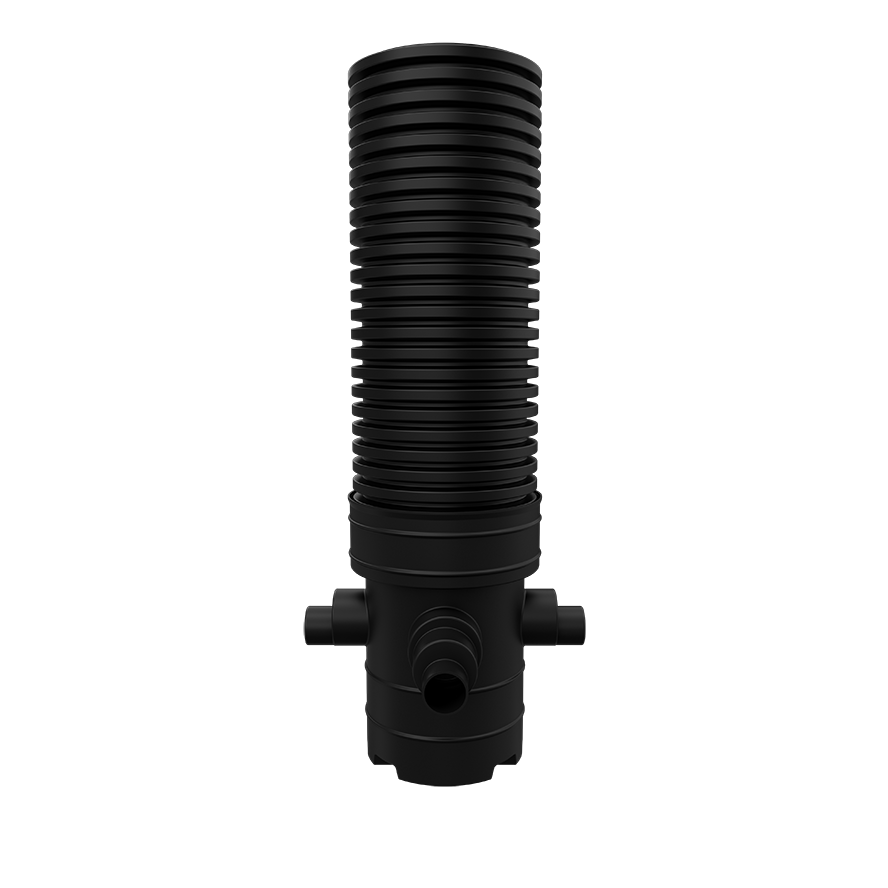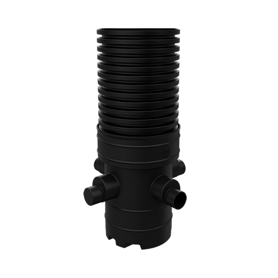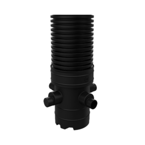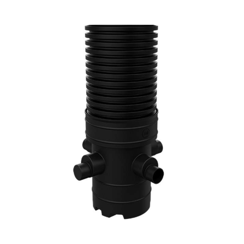 It features a Ø 450mm rotational moulded chamber base, which accommodates 110mm or 160mm EN 1401 main channel connections. Additionally, it includes two further 110mm or 160mm EN 1401 side inlets positioned at 90° and 270° from the outlet at 0°. These side inlets are supplied as blanked ends, allowing for use as needed.