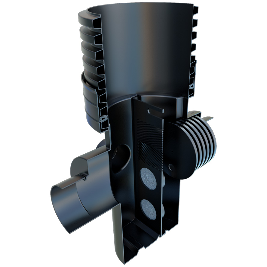 It features a Ø600mm rotational moulded chamber base, which accommodates 225mm or 300mm twinwall main channel connections accordingly. Additionally, it includes two further 150mm twinwall side inlets at 90° and 270° off centre from the outlet at 0°. Conversely, these side inlets are supplied as blanked ends, allowing for use as needed.