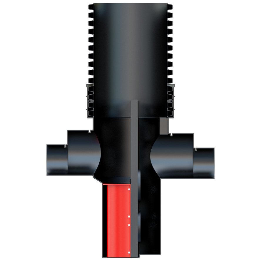 The SILTBLOK SB500B silt separator features a Ø500mm rotationally moulded chamber base, compatible with 150mm or 225mm twinwall main channel socket connections.